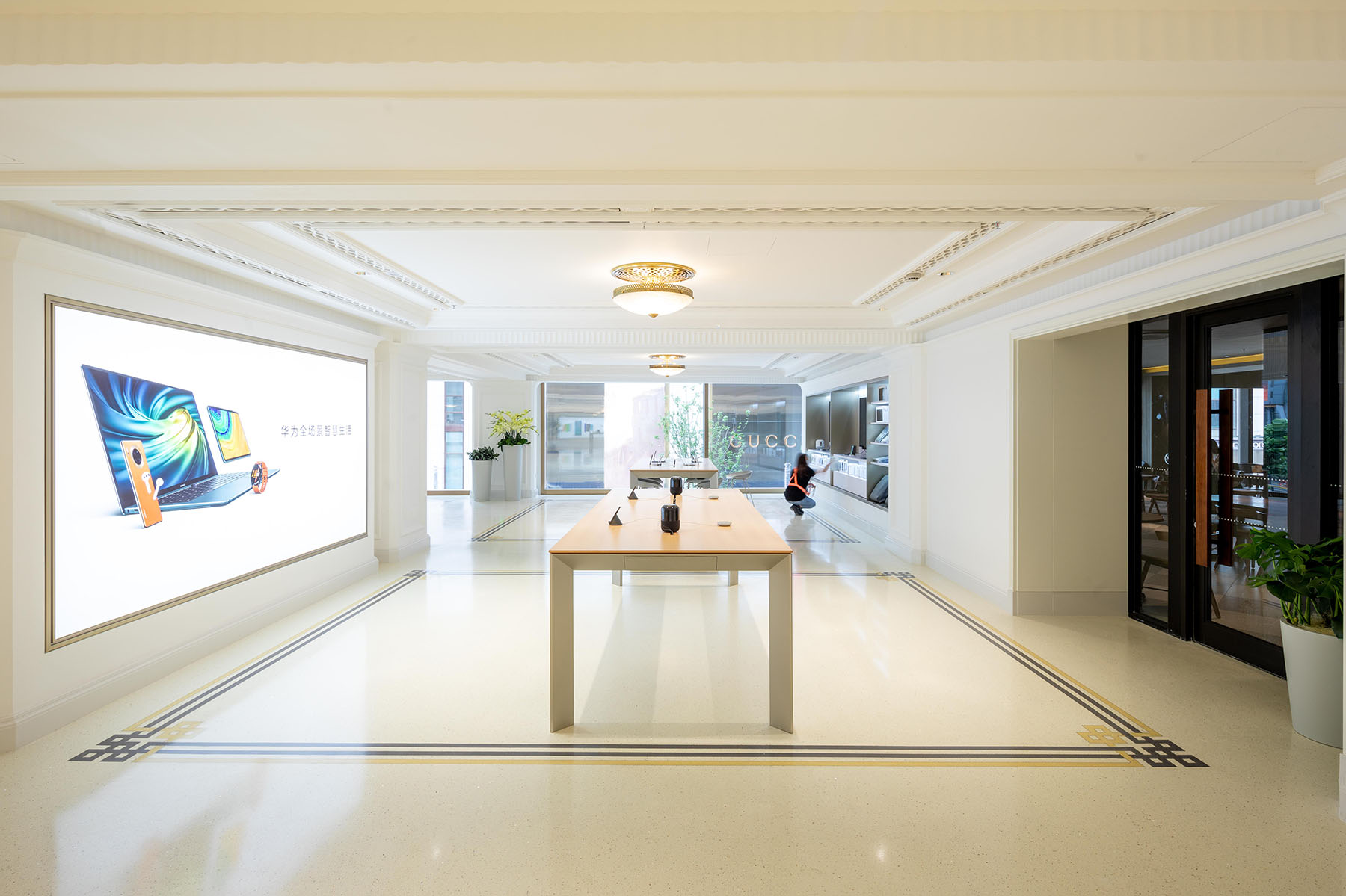 多樣的色彩和無(wú)限的搭配增添了金磨石的設(shè)計(jì)要素,華為旗艦店整體以大氣舒適為設(shè)計(jì)理念,以白色金磨石為基底,圖案采用金色與黑色的混搭,運(yùn)用線條的美感展現(xiàn)其設(shè)計(jì)理念,這也是金磨石地面優(yōu)于其他地面的體現(xiàn)